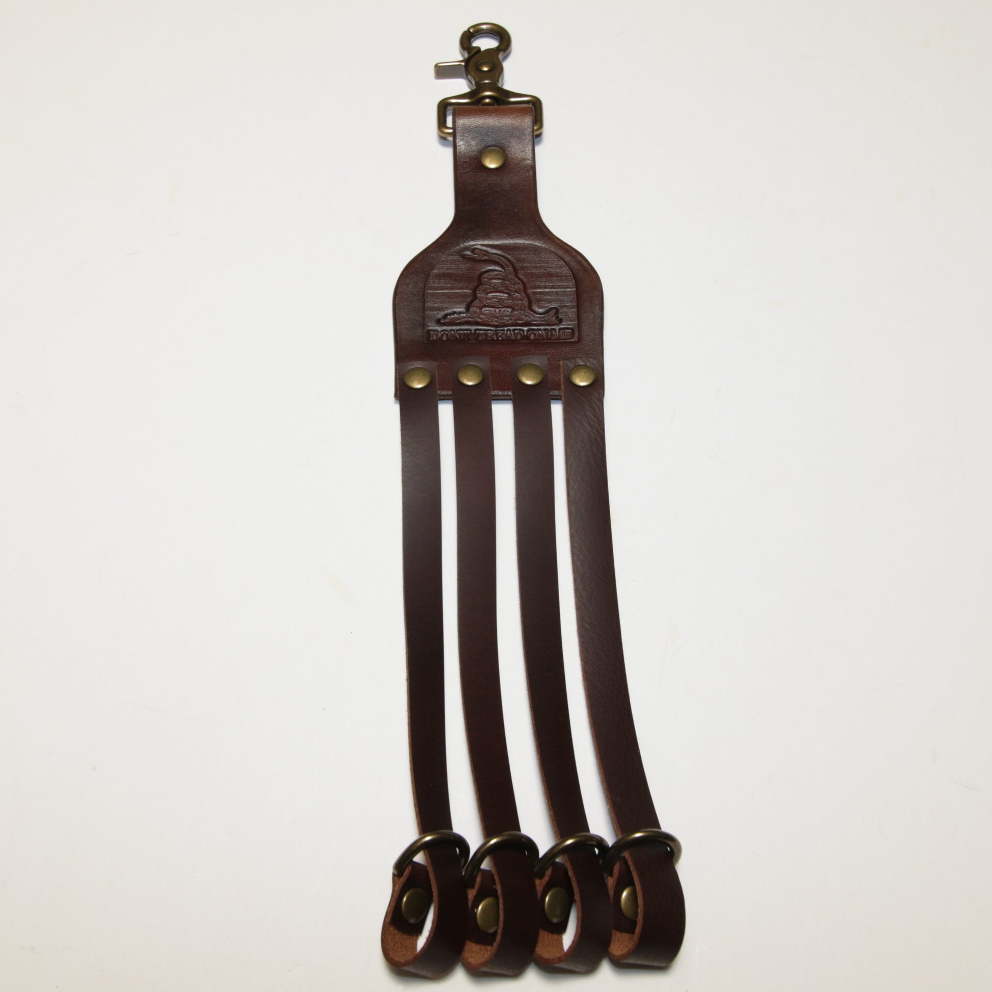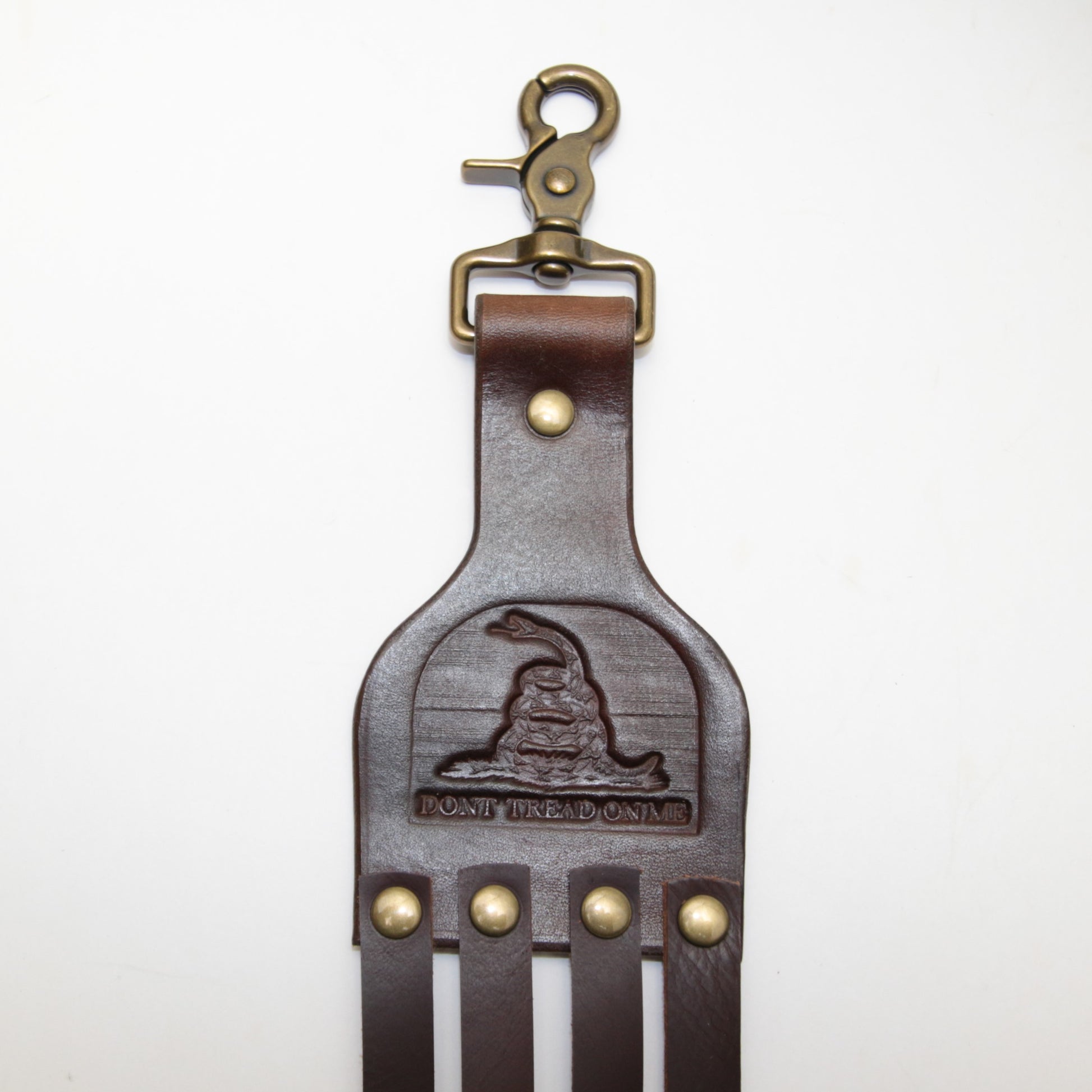 Handmade genuine leather game carrier stamped with the Gadsen Flag emblem and motto. Solid brass hardware. Limited availability. Shipping included.