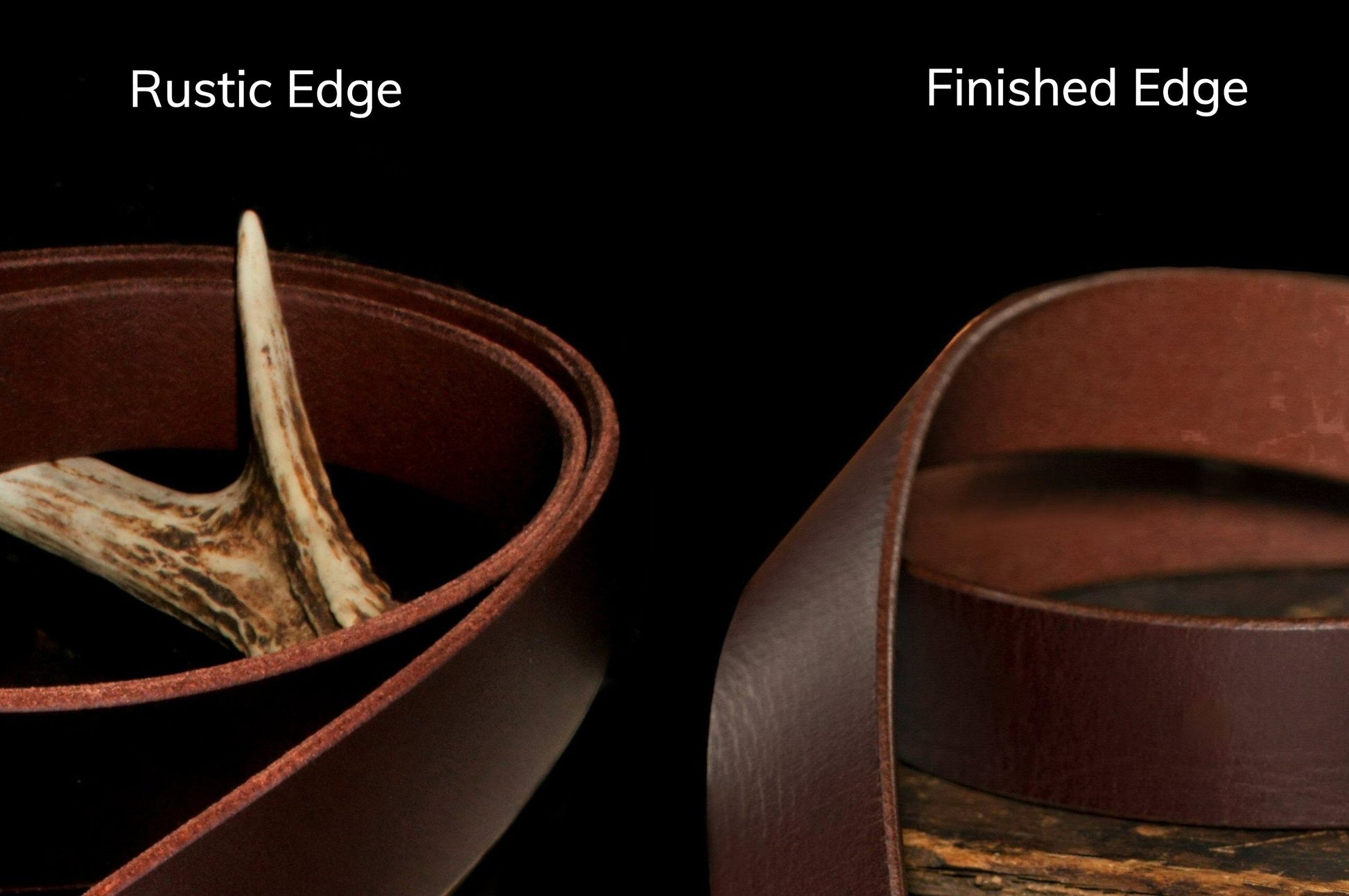 This sling has a finished edge. We offer the same sling with rustic edges if a finished edge is not important to you and if you want to save some money. Our Model FR has the rustic edge.